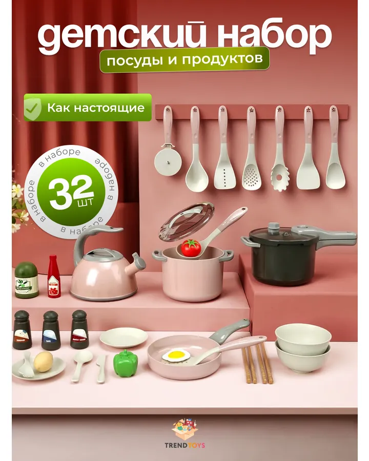 Игрушка TrendToys посуда, продукты, чайник 32 предм.Прекрасный набор детской посуды, очень порадовал размер, не малюсенький как часто бывает, а очень даже внушительный для маленькой хозяйки) много нужных элементов, качество на высоте. Хорошо что выбрала именно его!