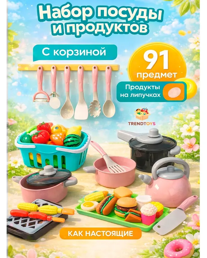 Игрушка TrendToys Посуда и продукты 74 предм.Упакован хорошо, посуда хорошего качества, пластик без запаха, что не маловажно.Брала в подарок внучке 2,5 года.