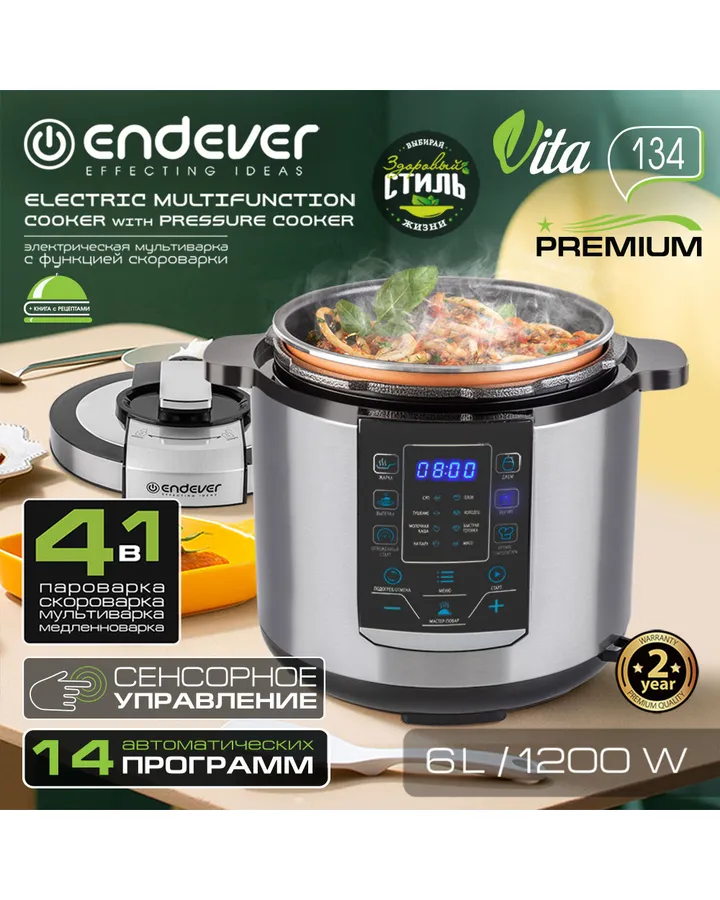 Мультиварка ENDEVER Vita-134, сенсорное управление, 14 программ, 6л