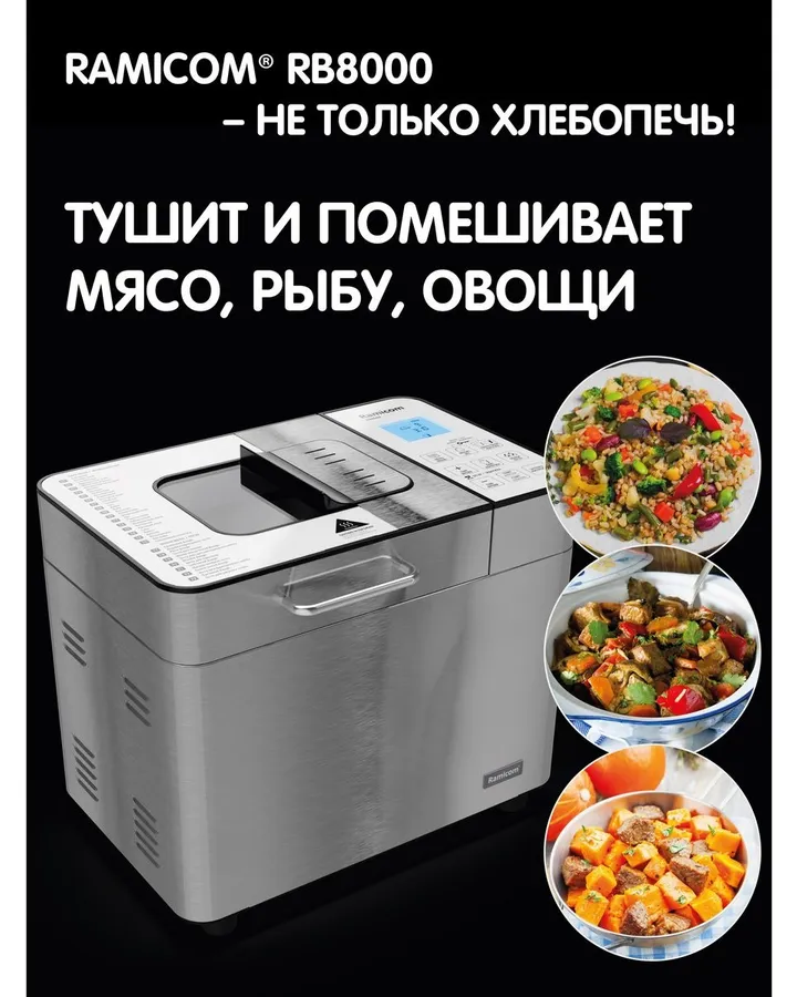 Хлебопечка Ramicom Мультишеф 23 в 1 RB8000Мужу понравился рещим тушения) Пришел с работы все закинул и сидит телевизор смотрит. Но и хлеб печет отлично.
