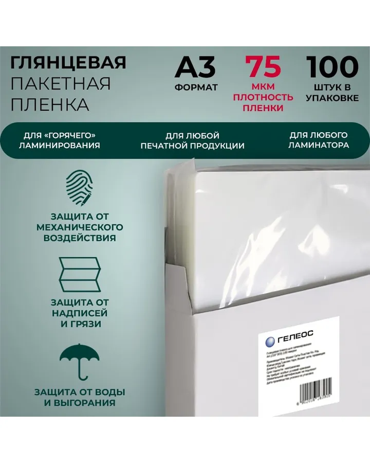 Пленка для ламинирования ГЕЛЕОС LPA3-75 формат А3 303 х 426 75 мкм 100 шт