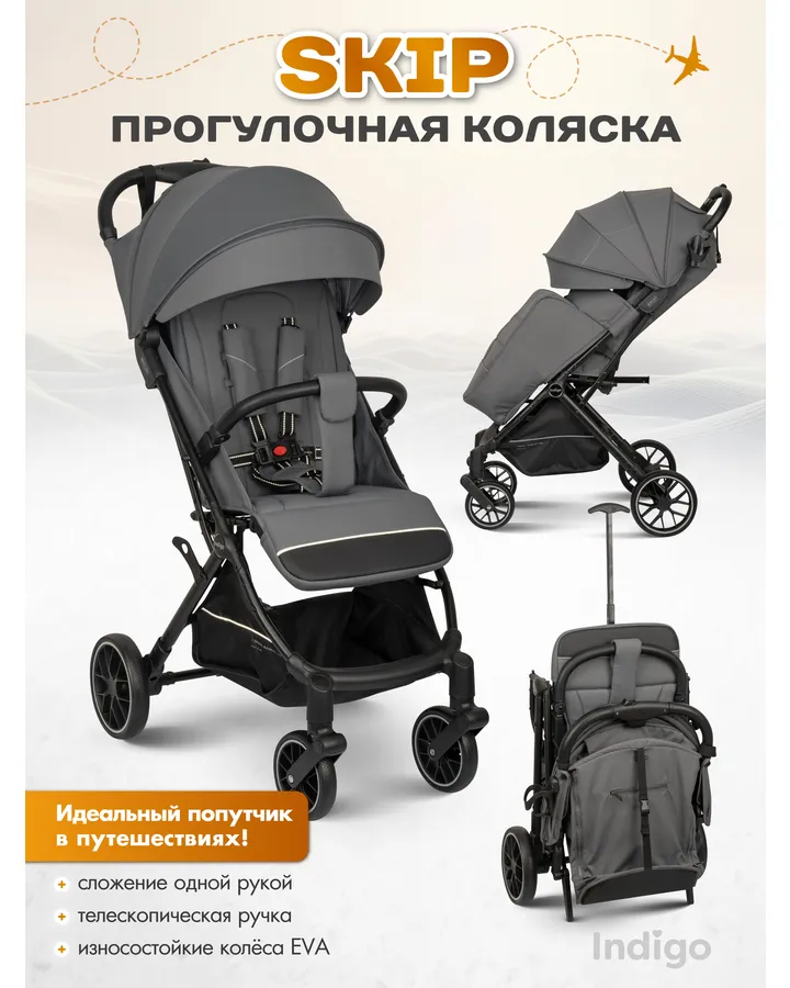 Коляска прогулочная Indigo Skip для путешествий бежевыйНебольшая, удобная Катаемся по деревенской дороге, проблем нет Выдерживает тяжёлый пакет Делается полностью в лежачее положение Легко складывается и раскладывается