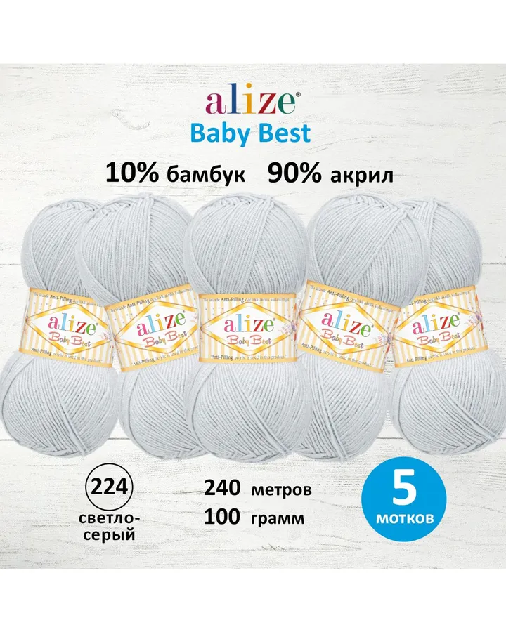 Пряжа для вязания Alize baby best бамбук акрил с эффектом антипиллинг 100 г 240 м 224 светло серый 5 мотков