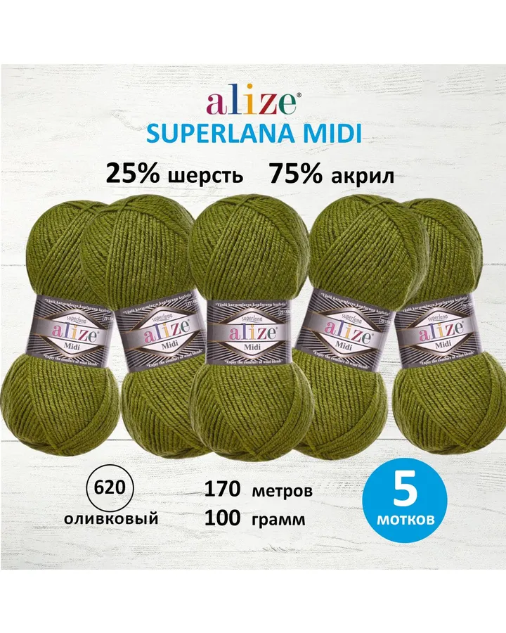 Пряжа Alize теплая для вязания одежды Superlana Midi 100 гр 170 м 5 мотков 620 оливковый