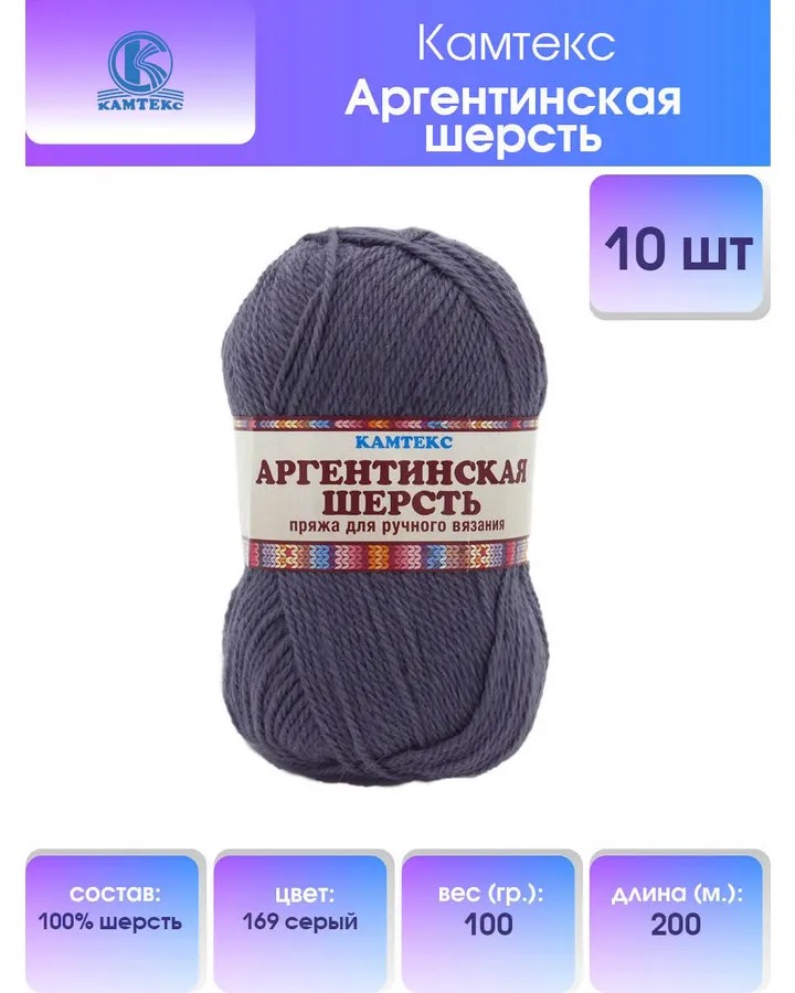 Пряжа Камтекс Аргентинская шерсть классическая 100 г 200 м 169 серый 10 мотков