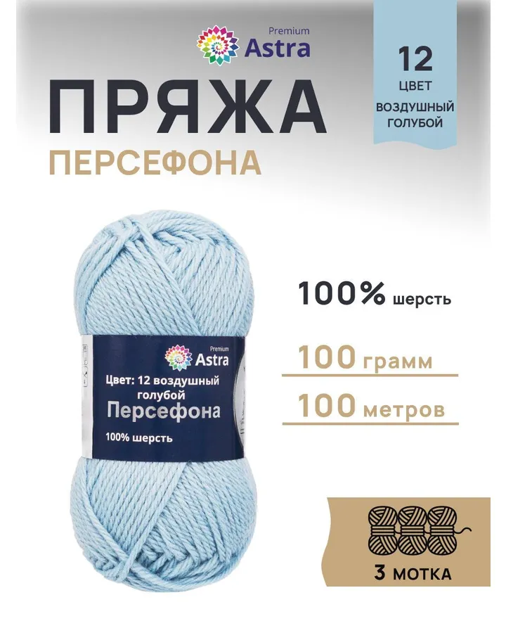Пряжа Astra Premium Персефона шерстяная 100 г 100 м 12 воздушный голубой 3 мотка