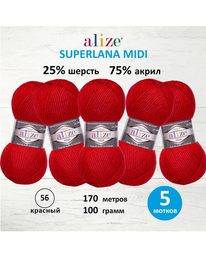 Пряжа Alize теплая для вязания шарфов шапок Superlana klasik 100 г 280 м 5 мотков 56 красный