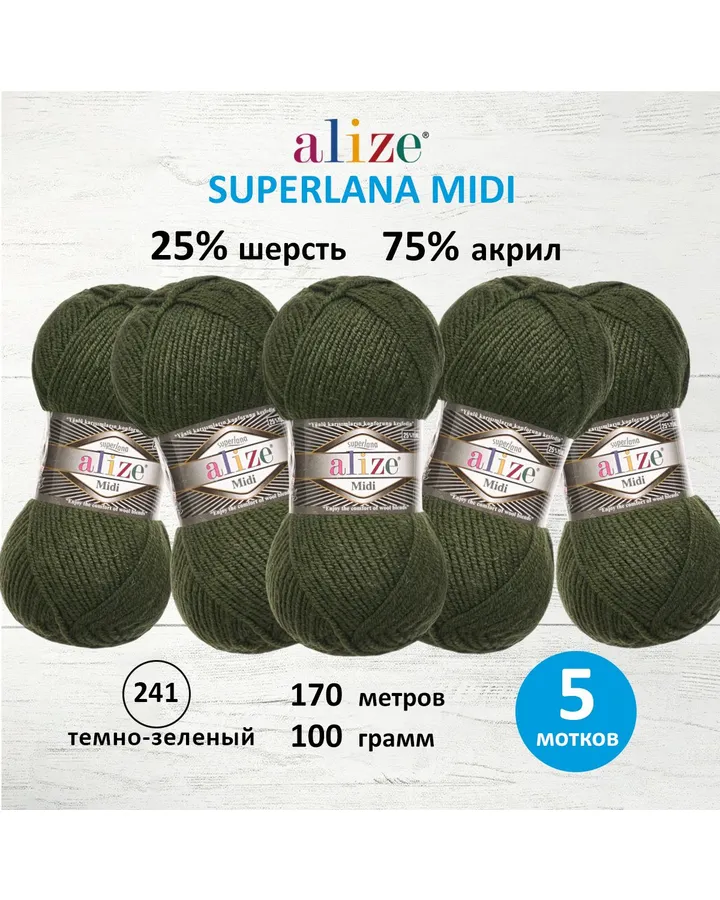Пряжа Alize теплая для вязания шарфов шапок Superlana klasik 100г 280 м 5 мотков 852 зелёный