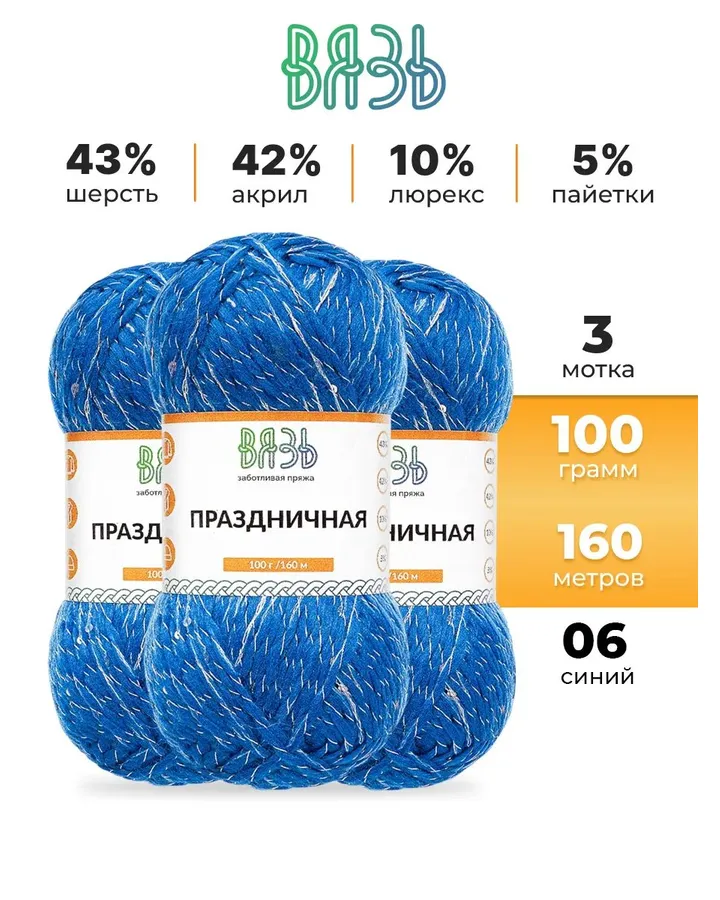 Пряжа ВЯЗЬ для вязания Праздничная 100 гр 160 м 3 мотка 06 синий