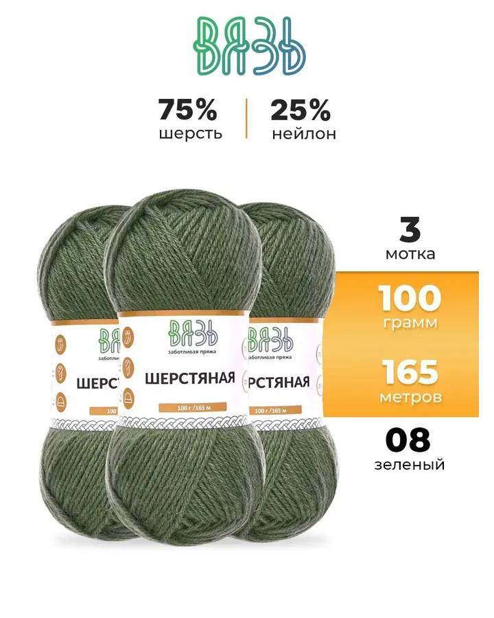 Пряжа ВЯЗЬ Шерстяная для повседневной одежды 100 гр 165 м 3 мотка 07 светло-зеленый