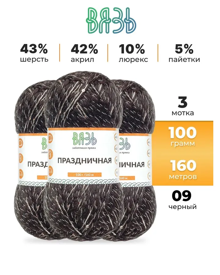 Пряжа ВЯЗЬ для вязания Северная универсальная 100 гр 210 м 3 мотка 04 черный