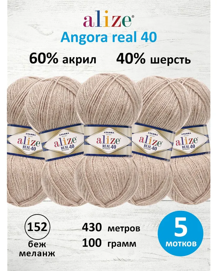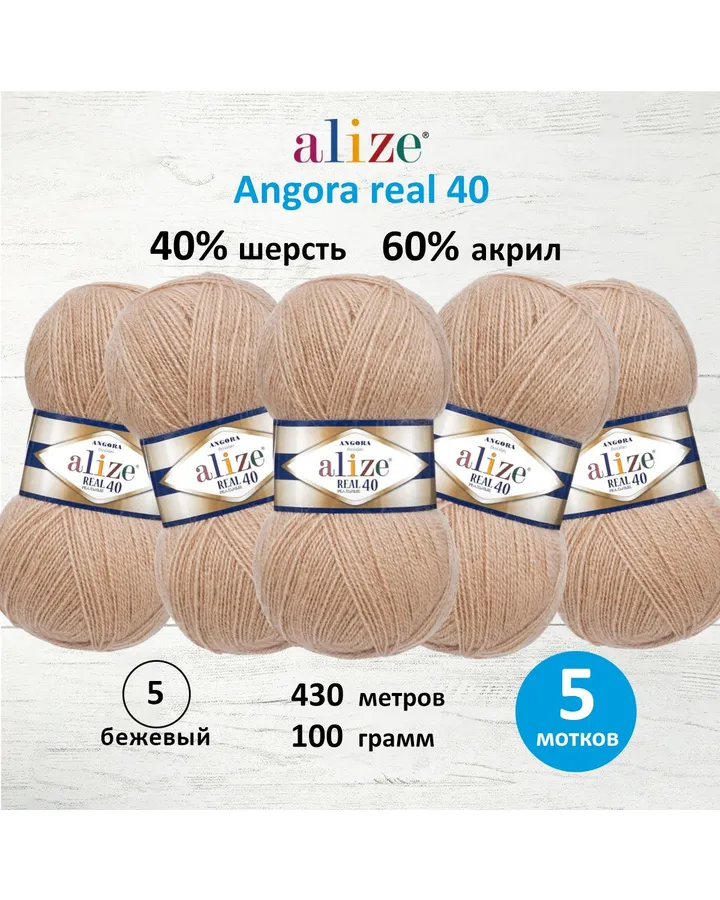 Пряжа Alize мягкая для вязания Angora real 40 100 гр 430 м 5 мотков 05 бежевый