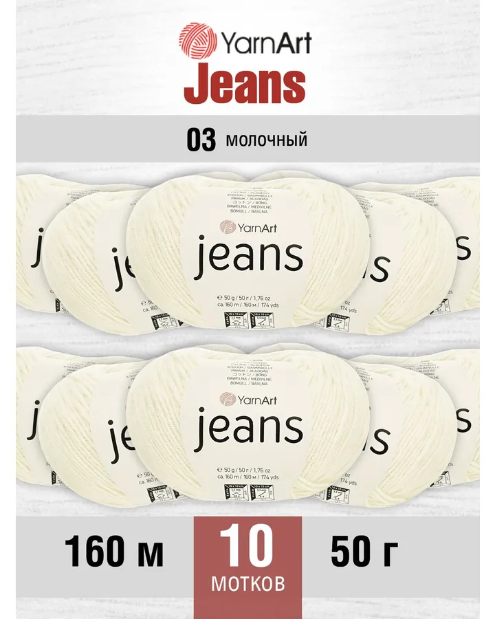 Пряжа YarnArt Jeans универсальная 50 г 160 м 03 молочный, 10 мотков