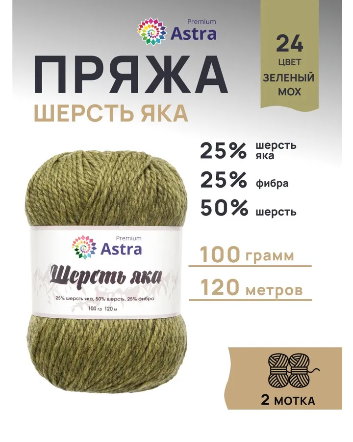 Пряжа Astra Premium Шерсть яка Yak wool теплая мягкая 100 г 120 м 24 зеленый мох 2 мотка