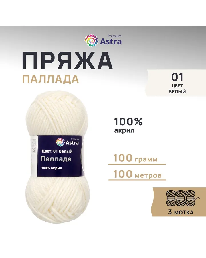 Пряжа Astra Premium Паллада акриловая 100 г 100 м 01 белый 3 мотка
