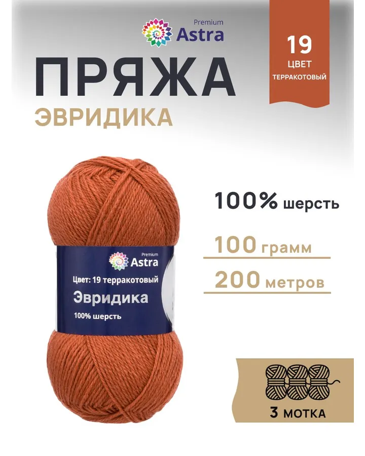 Пряжа Astra Premium Эвридика шерстяная 100 г 200 м 19 терракотовый 3 мотка