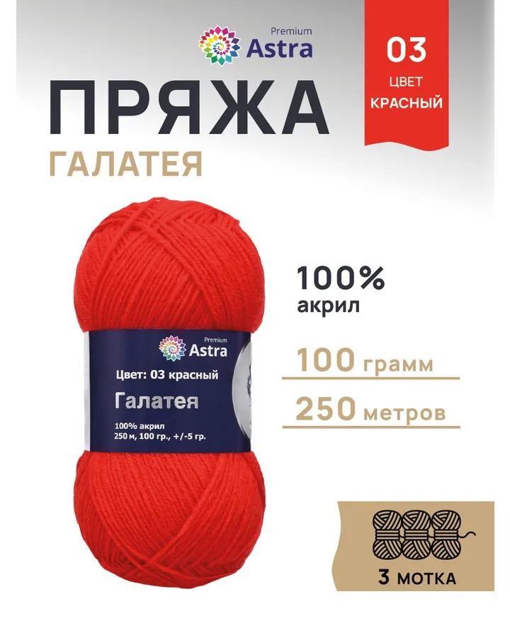 Пряжа Astra Premium Галатея акриловая 100 г 250 м 03 красный 3 мотка