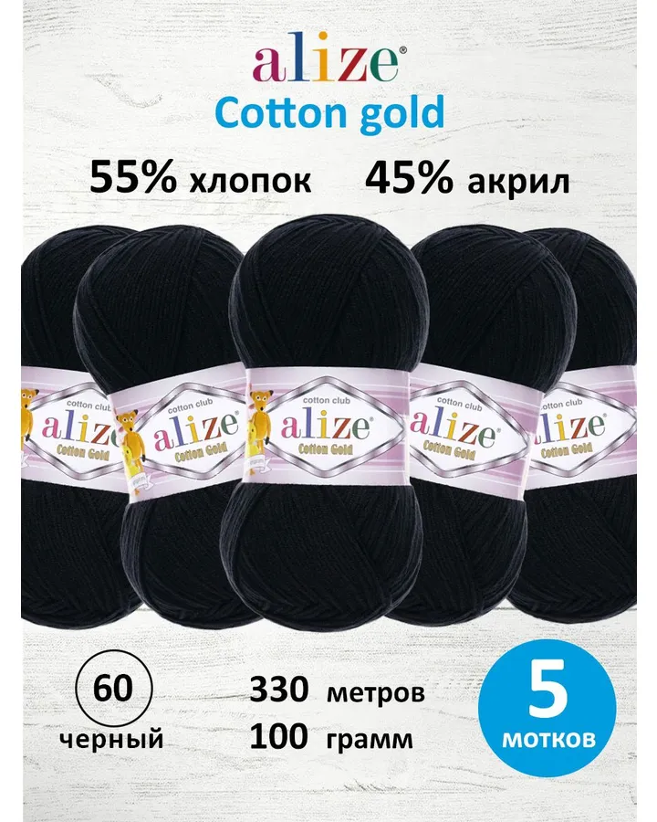 Пряжа Alize для теплой одежды пледов игрушек Cotton gold 100 гр 330 м 5 мотков 60 черный