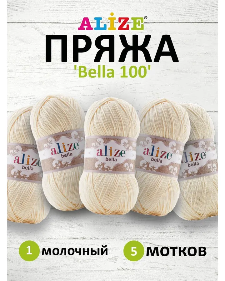 Пряжа Alize для теплой одежды Bella 100 100 гр 360 м 100% хлопок 5 мотков 1 молочный