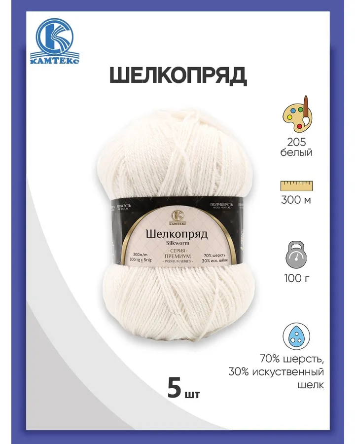 Пряжа Камтекс Шелкопряд шерстяная с искусственным шелком 100 г 300 м 205 белый 5 мотков