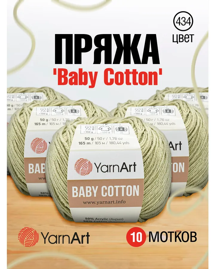 Пряжа для вязания YarnArt Baby Cotton 50гр 165 м хлопок акрил детская 10 мотков 435 светло-зеленый