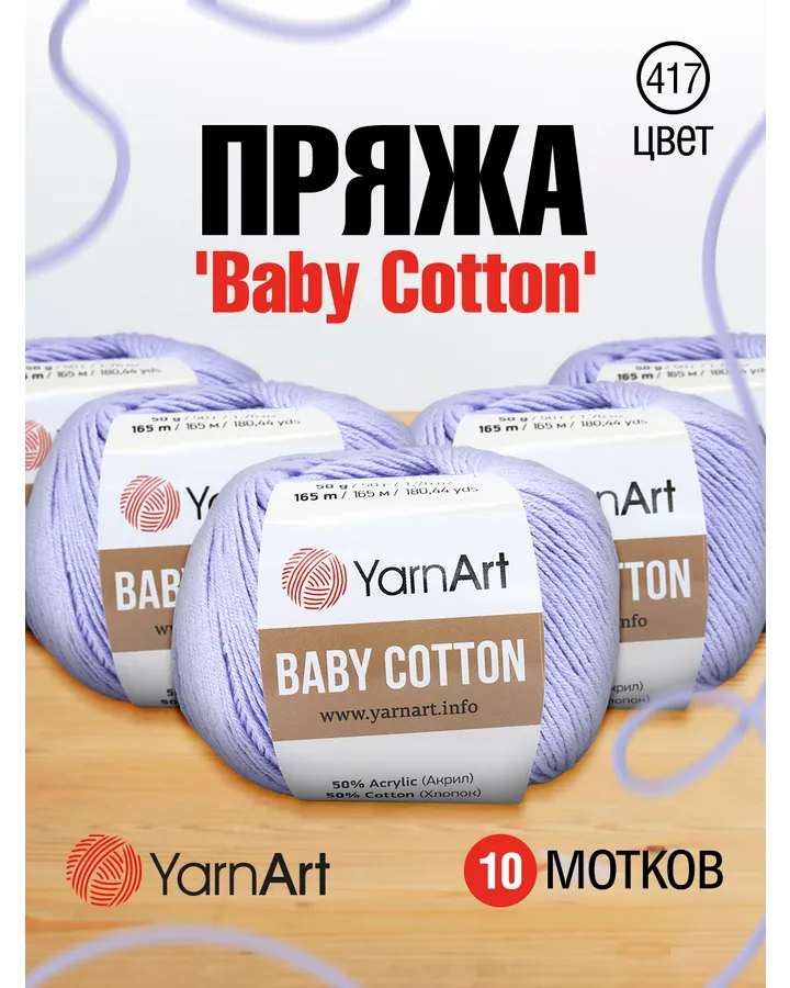 Пряжа для вязания YarnArt Baby Cotton 50гр 165 м хлопок акрил детская 10 мотков 417 светло-сиреневый