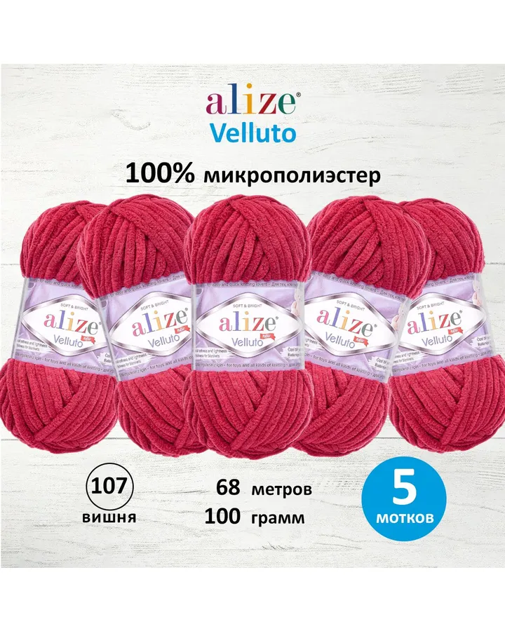 Пряжа для вязания Alize velluto 100 гр 68 м микрополиэстер мягкая велюровая 56 красный 5 мотков