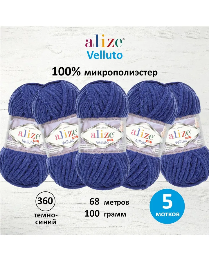 Пряжа для вязания Alize velluto 100 гр 68 м микрополиэстер мягкая велюровая 360 темно-синий 5 мотков