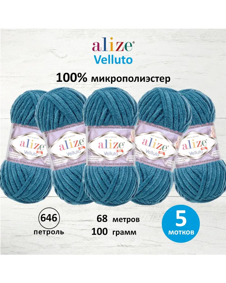 Пряжа для вязания Alize velluto 100 гр 68 м микрополиэстер мягкая велюровая 646 петроль 5 мотков