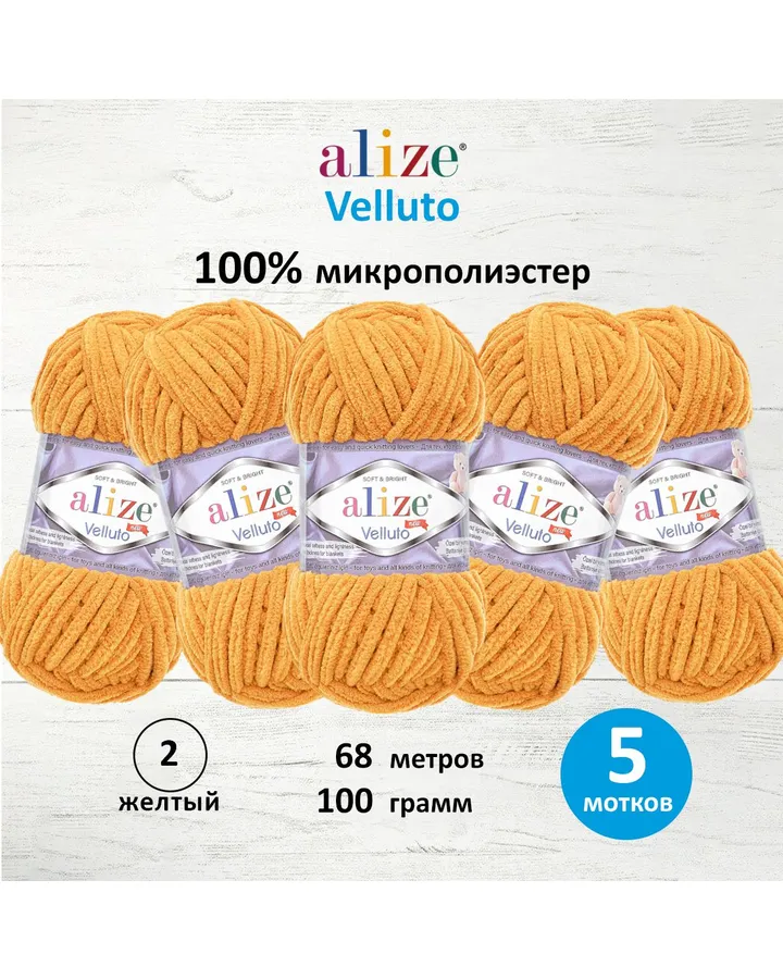 Пряжа для вязания Alize velluto 100 гр 68 м микрополиэстер мягкая велюровая 02 желтый 5 мотков
