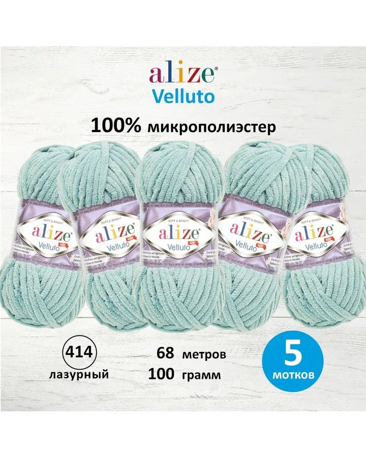 Пряжа для вязания Alize velluto 100 гр 68 м микрополиэстер мягкая велюровая 414 лазурный 5 мотков