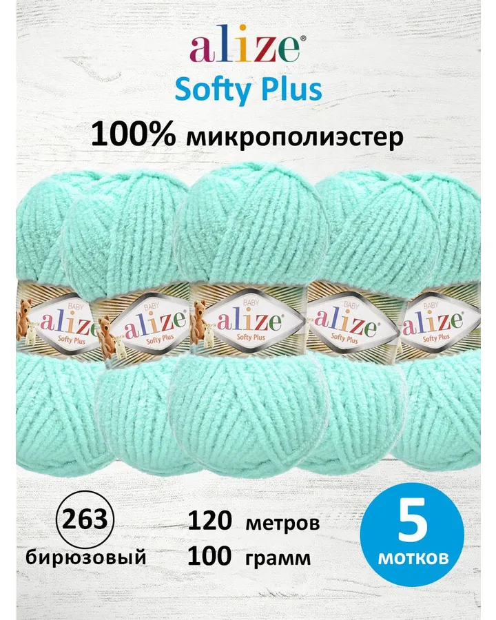 Пряжа для вязания Alize softy plus 100 г 120 м микрополиэстер мягкая плюшевая 263 бирюзовый 5 мотков