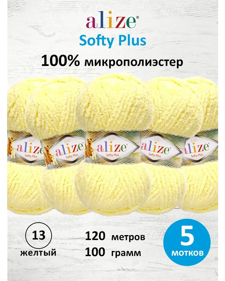 Пряжа для вязания Alize softy plus 100 г 120 м микрополиэстер мягкая плюшевая 13 желтый 5 мотков
