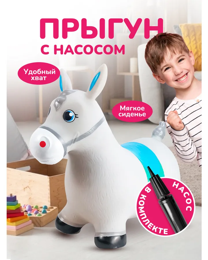 Отличная лошадь. Брали ребенку 1.5, рост 83 Залезает пока конечно не махом, но сидеть комфортно. Так же нет насоса в комплекте, имейте в виду! Мы сразу взяли отдельно