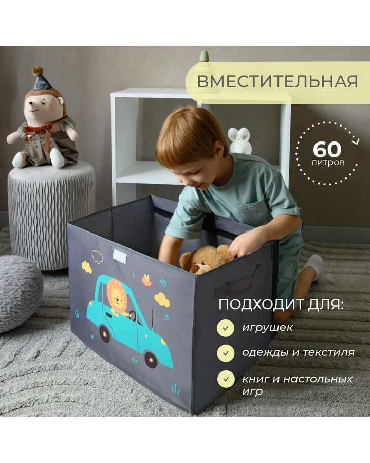 Коробка для игрушек Всё на местах с крышкой 50х35 Львенок в машинке серый