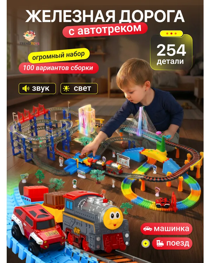 Набор железнодорожный TrendToys 230 смХорошая дорога, небольшая, поезд очень ловко едет. Красивый набор. Хотелось бы докупить часть элементов дороги
