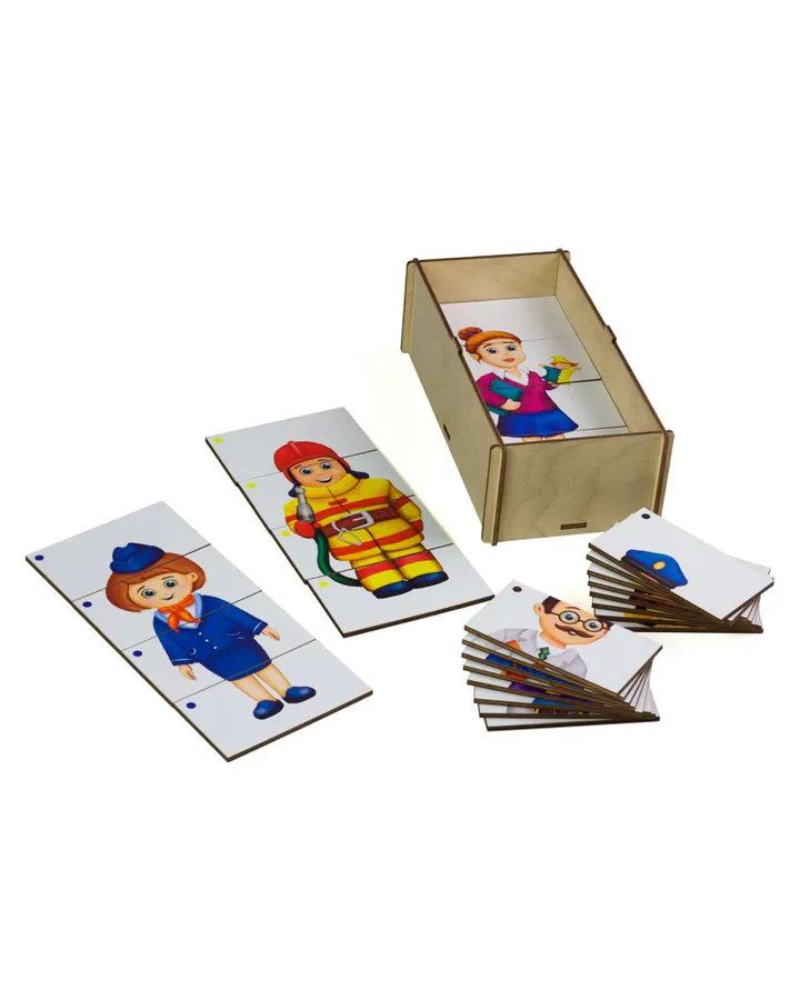Набор с большим выбором карточек. Есть миниподсказка для деток в виде круглых точек определённого цвета, помогающих правильно собрать пазл. Ребёнку нравится.