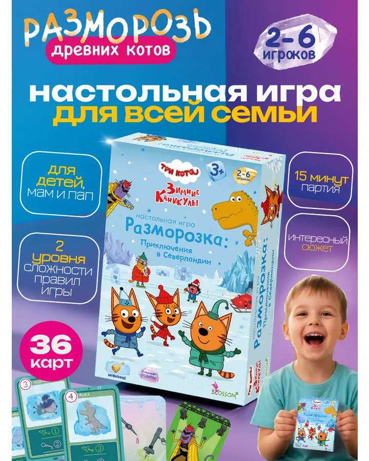 5Настольная игра Три котаОчень понравилась игра! Закажем еще в подарок племянникам - небольшая компактная коробочка, любимые герои ребенка - Три Кота, интересная задумка - честно говоря, не похожа ни на какую другую игру, очень занимательная. Сыграли несколько партий сразу, счастья у ребенка было много, в том числе от победы))) Нужно размораживать древних котов и разную живность - интересное дополнение к основной вселенной. Есть в правилах и повышенный уровень сложности, пока что сын в восторге и от базового. Спасибо, игру рекомендую! С 5-6 лет.