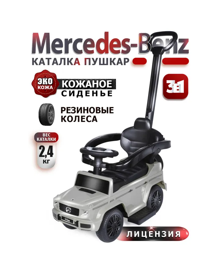 5Каталка BabyCare Mercedes-Benz G350d с ручкой серыйРебенку очень понравилась каталка , слезать с нее не хочет . Пластик крепкий , музыка в руле, сиденье мягкое , упаковано отлично . Брали на годик .