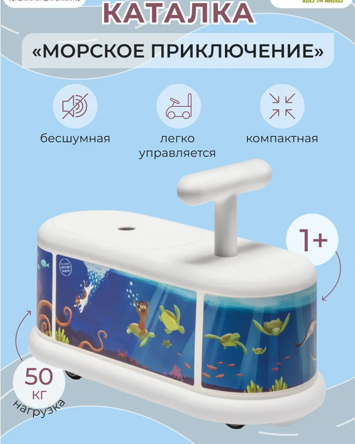 Приятный нежный голубой цвет, хорошо впишется в любой интерьер. Ребенок пока маловат (10 мес), не достает ножками до пола, катаем сами, чтобы привыкал) Ребенку очень нравится.