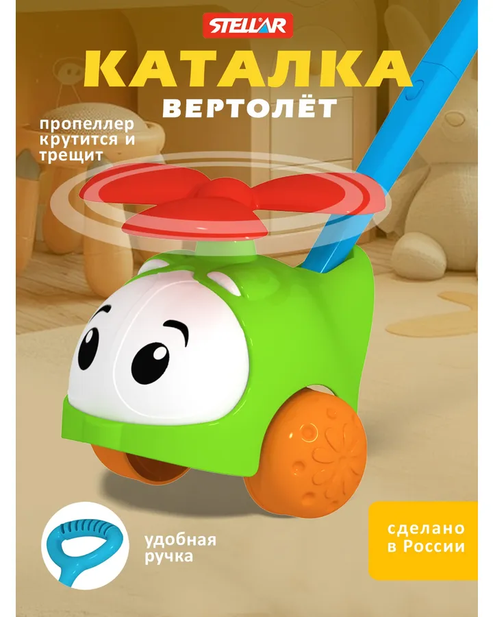Каталка STELLARХорошая и качественная каталка. Удобная ручка, едет и дома и по асфальту, крутиться верхний пропеллер при езде, красочный вертолётик, у нашего малыша был в зеленом цвете. Ручка вставляется один раз , разобрать нельзя, поэтому надежно крепиться. Каталкой довольны, никаких острых углов, зазубрин, все гладко.