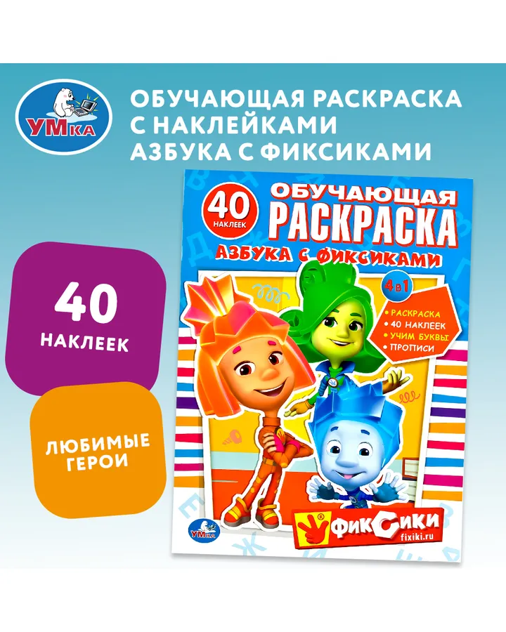 Обучающая раскраска УМка Азбука с фиксиками 4 в 1 40 наклеек