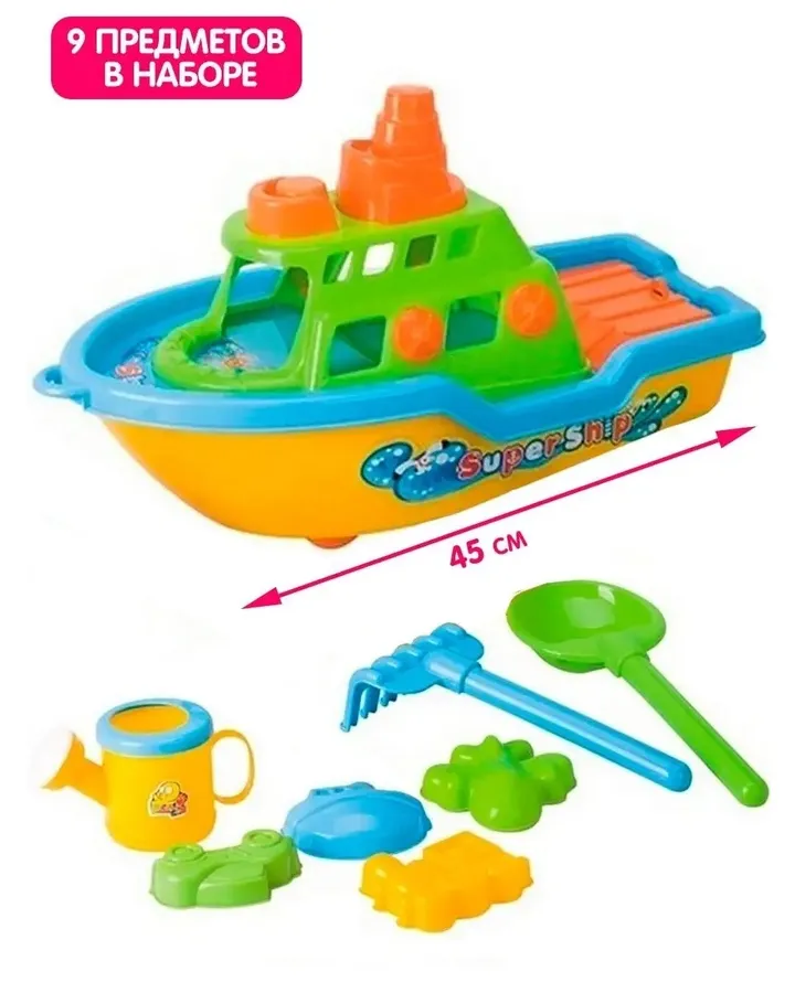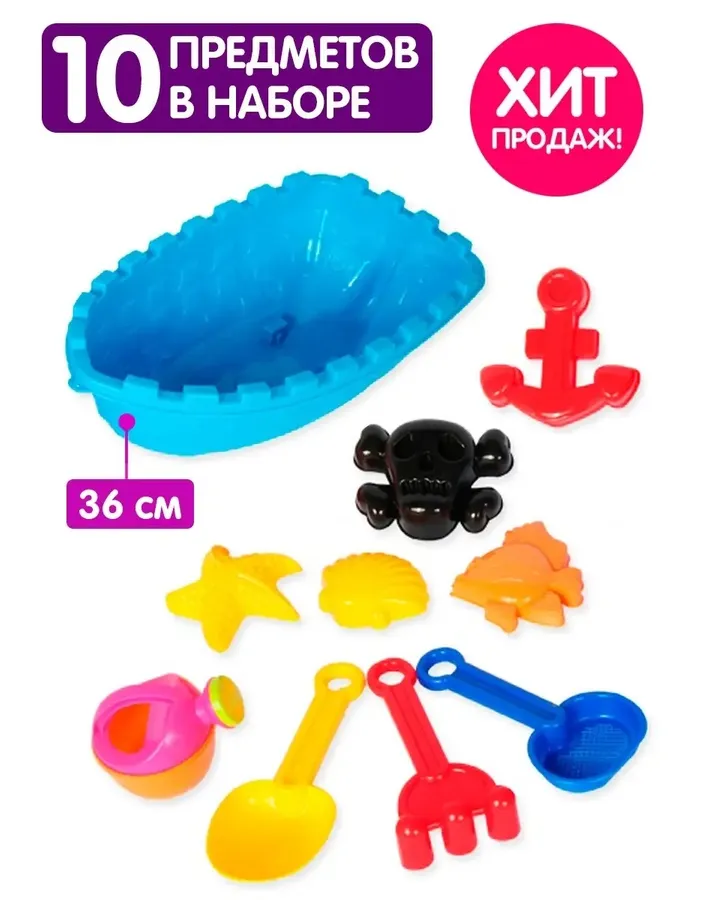 Супер, лодка большая на колёсиках, формочки из толстого пластика)) ребёнок счастливый 😃