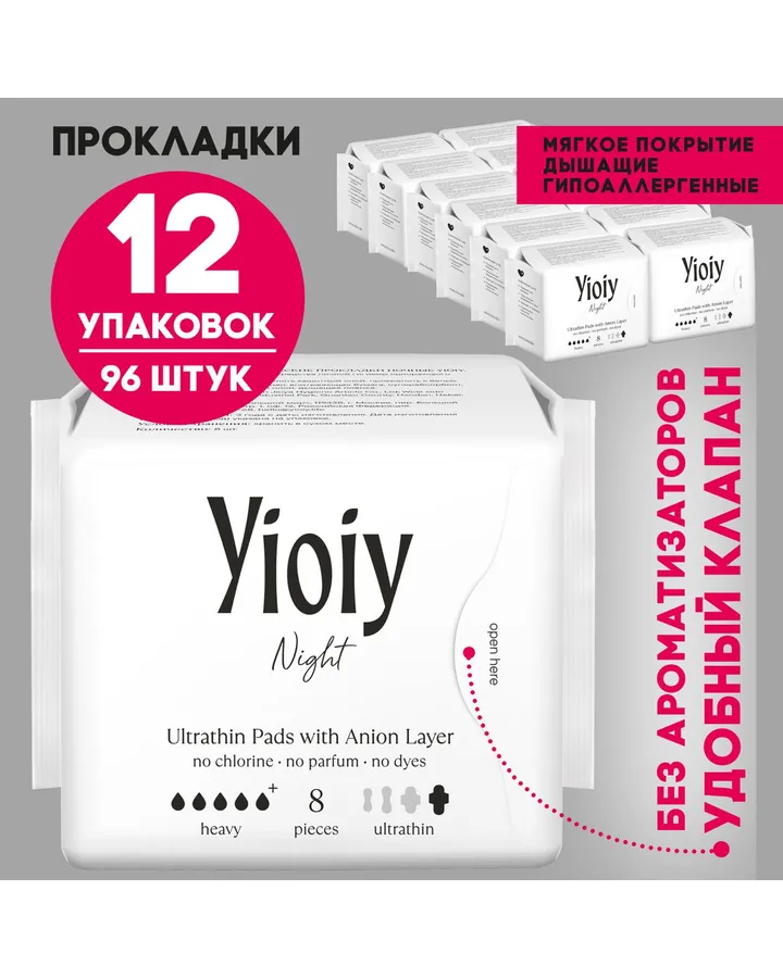 Прокладки YIOIY ночные с крылышками и бортиками 8шт. x 12