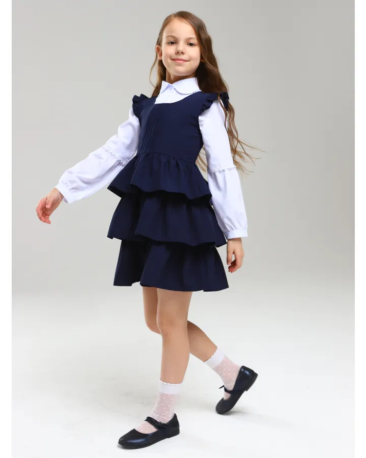 В ассортименте представлены классические оттенки, такие как синий и серый. Для удобства девочек предусмотрены карманы, застежки и ремни, обеспечивающие комфортную посадку на любой рост. Аксессуары, например, галстуки или банты, помогут дополнить школьный лук.