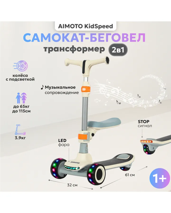 Самокат Aimoto трехколесныйНадёжный и качественный. Колёса светятся, фара и стоп тоже светятся. Можно отстегруть сидение и беговел станет самокатом. Музыку отключил, просто отсоединил контакты от динами. Ребёнку подарок понравился.