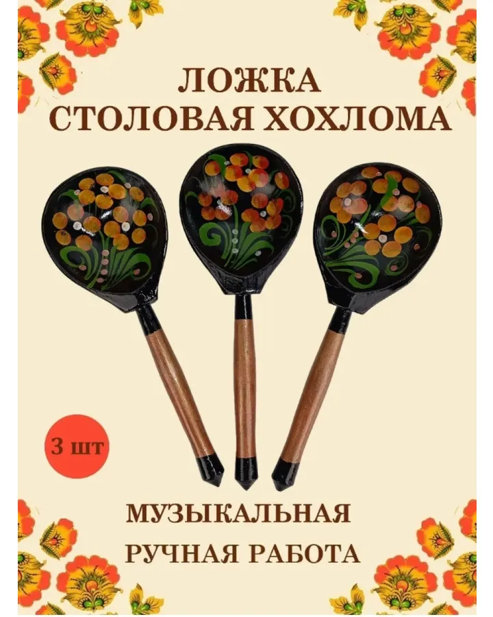 Ложка столовая Хохлома Оптом деревянная музыкальная Красный цветок - 3 шт.