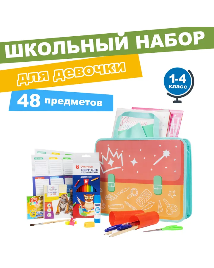 Набор школьника Отличник 57 предм.Отличный набор для подготовки к школе. Отдельно ничего не пришлось докупать, нашли в нем всё, что перечислил учитель. Приятный бонус - сама папка, которая также используется для переноски и хранения школьных принадлежностей.