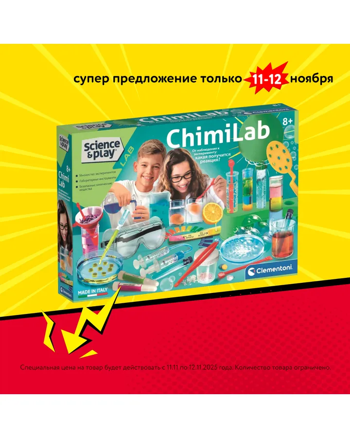 Набор для опытов Clementoni Химическая лабораторияПотрясающий набор! Ранее приобрели другой химический набор в Детском мире, на этот раз подарили ему на 9 лет данный набор - и он в полном восторге, да и мы, взрослые, с удовольствием участвовали в экспериментах. Набор действительно впечатляет - здесь есть все необходимое для настоящих химических опытов: колбы, пробирки, пипетки, защитные очки и различные реактивы, единственное – некоторые компоненты пришлось взять из дома.