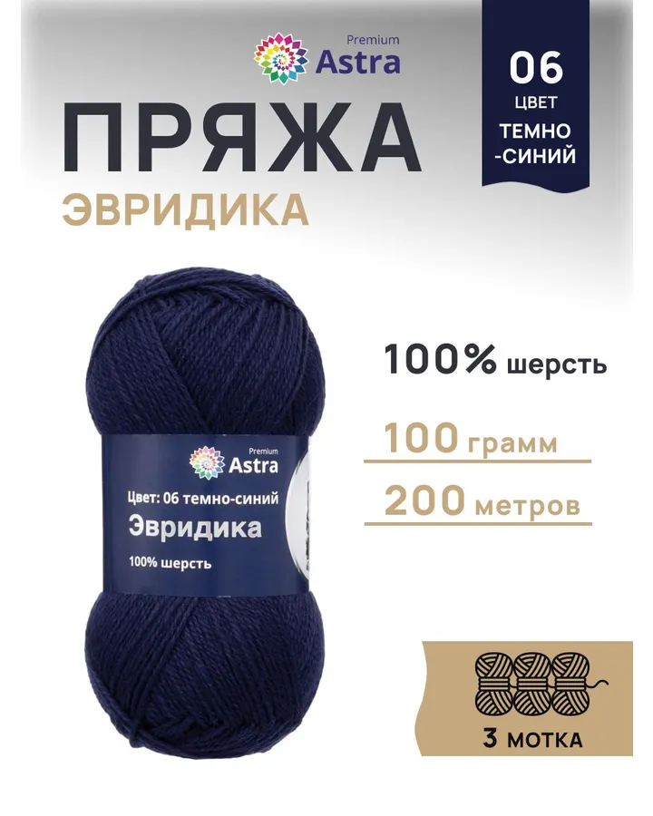 Пряжа Astra Premium Эвридика шерстяная 100 г 200 м 11 черный 3 мотка